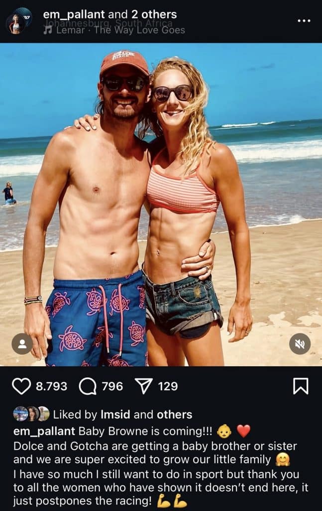 “Baby Browne is coming!!! Dolce and Gotcha are getting a baby brother or sister and we are super excited to grow our little family. I have so much I still want to do in sport but thank you to all the women who have shown it doesn’t end here, it just postpones the racing!