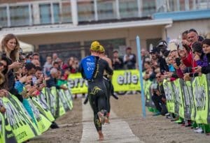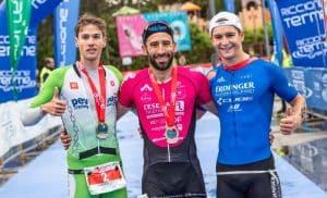 The water temperature was 16°C and the water was very wavy. Then at 9:30 the race for the Pro men started. I stood right next to the last year’s winner Gulio Molinari at the start line, from whom I knew he is a very good swimmer. I swam on his feet immediately after the start and tried to find my rhythm which wasn’t easy in these tough conditions. But I managed to stay behind him and Mattia Ceccarelli for the whole 1.9km swim. We had almost a 1.5min gap to 4th place.