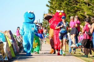 On the run course at Ironman Australia, and running along the waterfront, being followed by two dinosaur, The Cookie Monster and Elmo