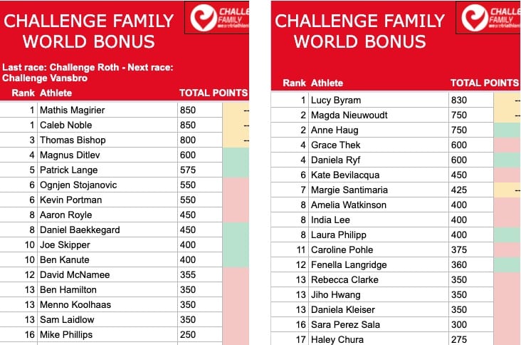 After a spectacular Challenge Roth – in which world records were smashed – the top five of the Challenge Family World bonus has changed quite a bit. Among others, Roth winners Magnus Ditlev and Daniela Ryf have entered the top five of the standings, as well as runner-up Anne Haug. Incidentally, it is still Mathis Margirier/Caleb Noble and Lucy Byram who lead the World Bonus standings, but the differences are small.