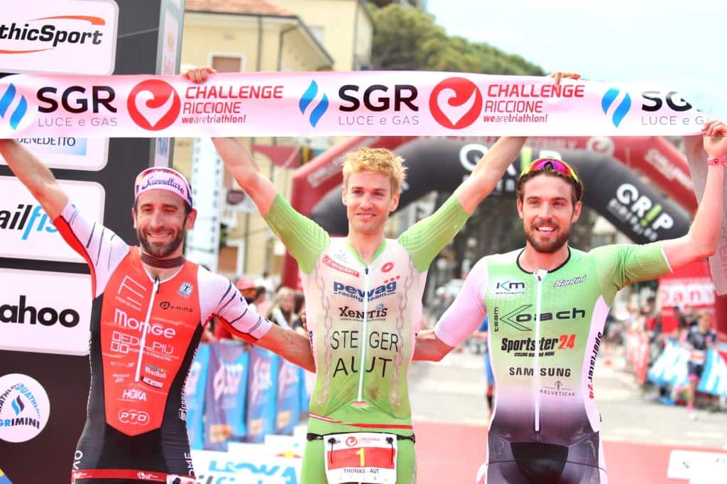 Near perfect conditions greeted over 1,200 athletes at Challenge Riccione on Italy’s Adriatic Coast today with Thomas Steger (AUT) successfully defending his title to make it two in a row in 3:37:40 and Emma Pallant-Browne (GBR) taking a convincing win in 3:56:50.