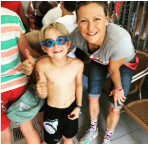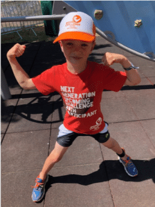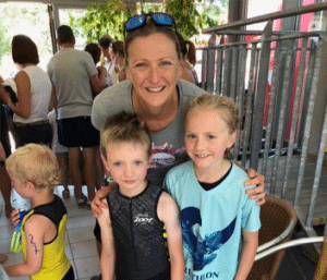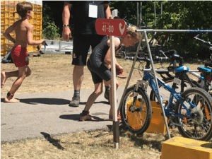 Finley: It was a swim, not a bike but a run. There were mostly girls in my lane. I had to swim 1 length (50m). I had to run over a hill, go into transition, put my shoes on, leave my goggles in the box, leave my hat at the red arch and run around the ball court then onto the finish stage. I was racing with the number 1 bib!!!