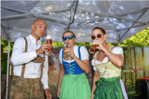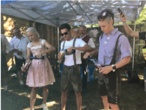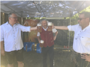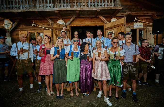 The unofficial, official opening to Challenge Roth, The Erdinger Party held on the Thursday night, where it’s a chance to see the Pros dress up in traditional Dirndls and Lederhosen. Or feel free to bring your own and join in as well. The more the merrier. This year the event had a twist as a team competition was on the mentioned. Three teams, led by Ralf Beyer (Mayor of Heideck), Felix Walchshoefer and Hans Raithel (Deputy Major of Roth), then each had two Pro Athletes, or a Pro athlete who was racing, and then perhaps a non racing Pro, or an ex Pro! Round one was the Beer Hold. The three team captains had to hold a stein of beer straight out for as long as possible. Round two was the perfect beer pour from bottle to glass and round three was the beer drinking! (Please note this is Alkoholfrie beer!)
