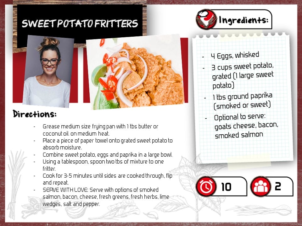 Jamielle is going to share her favourite recipes with all of us every week. Today we’ll start with the first -extremely delicious- one: Sweet Potato Fritters.