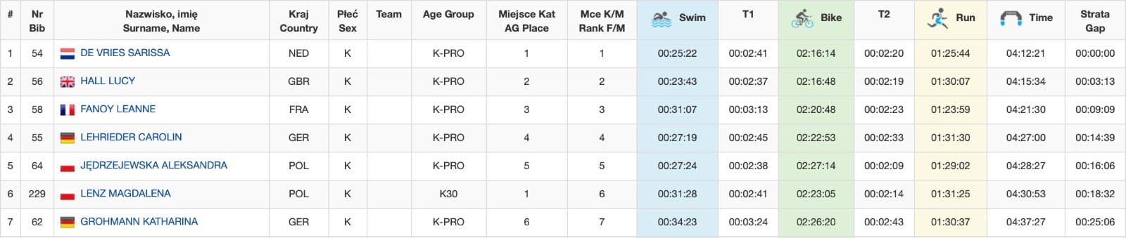 With De Vries a little over one minute behind, Hall went out on the run course with a dangerous chaser breathing down her neck. After about 5km, De Vries ran herself to first place. Hall hung in strongly for a well-earned second place. Fanoy took the third podium spot, overtaking Germany’s Carolin Lehrieder.