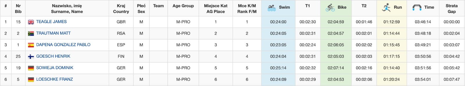 It may have been nearly three years since we last saw him race, but it was no surprise to see Lukasz Wojt – a former swimmer born in Gdańsk, but living in Germany – take the lead in the swim. Wojt left no room for doubt, with an impressive swim time of 22:21 minutes over 40 seconds ahead of his closest competitors: Dapena Gonzalez and Poland’s Brembor Tomasz. Six athletes where on the heels of the lead group. These chasers included James Teagle (GBR), Franz Loeschke (GER), Matt Trautman (RSA), Henrik Goesch (FIN) and Evert Scheltinga (NED), coming out of the swim 1:39 down on Wojt.