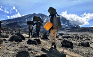 At the Londorosi entrance of the National Park all administrative procedures of registering the climbers are carried out and the loads that the porters will carry are inspected and weighed: a maximum of 20 kg per person. I weigh my backpack and it is 11 kgs. It’s plenty to carry for the 7 days that the trip will last: 5.5 days of ascent + 1.5 of descent. The porters carry 20 kg plus their backpack with their sleeping bag and their own items. They are otherworldly. I would like to know their blood profile. I also wonder what brands they would choose if given the opportunity to ride a bike from an early age.