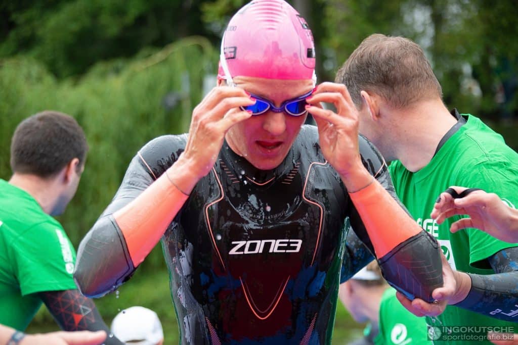 Race morning started very hectic. While checking in my bike I realized a cut in my tire, which didn’t look too trustworthy and we decided to change it, even though running out of time… Luckily, I had my husband and a mechanic from my bike partner Canyon around to do it for me. You might know that feeling… being forced to do last-minute changes is not really a great start into race day… However, we managed to get everything sorted in time and I was ready to start the race in – probably the coldest swim I have ever encountered in my career.