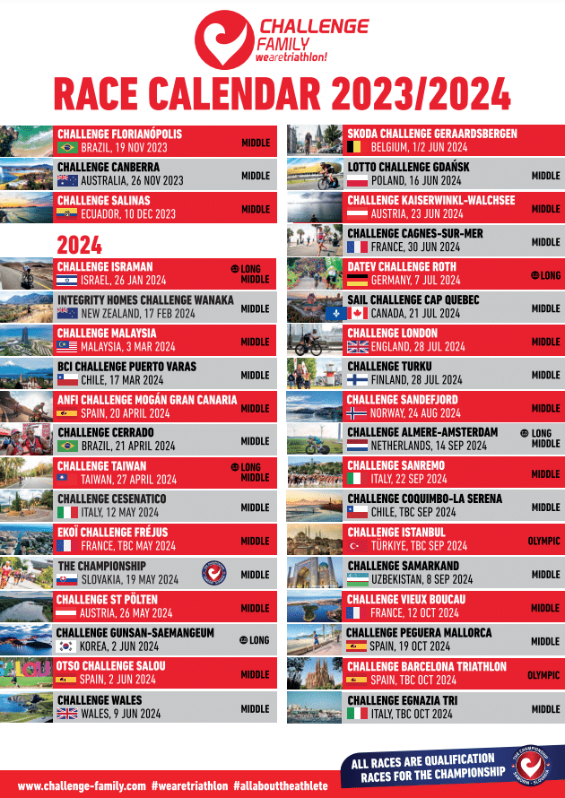 How are your 2024 race plans playing out for you? Will you travel to fulfil your triathlon finish line dreams, or stay closer to home? Are you thinking long, middle or short? Fast, flat and furious or scenic mountains and lakes? Do you want something fun for the family to do or will you fly solo? Whatever you decide, with just under 40 races on five continents, we’ve got the perfect one for you! Just click here for our race calendar (or watch it below) and head to www.challenge-family.com/races for further information about our races. We look forward to seeing you on the start line next year!